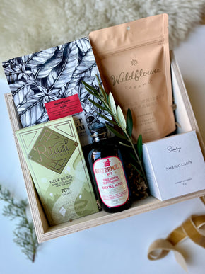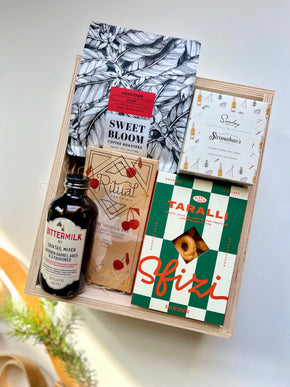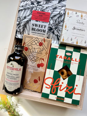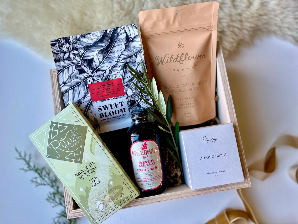 Ohhh, the Old Fashioned. This bundle was inspired by my husband’s all time favorite cocktail. The kit includes a handcrafted whiskey cocktail mixer, tasty snacks, and a bag of delicious whole bean coffee for the morning after.